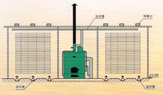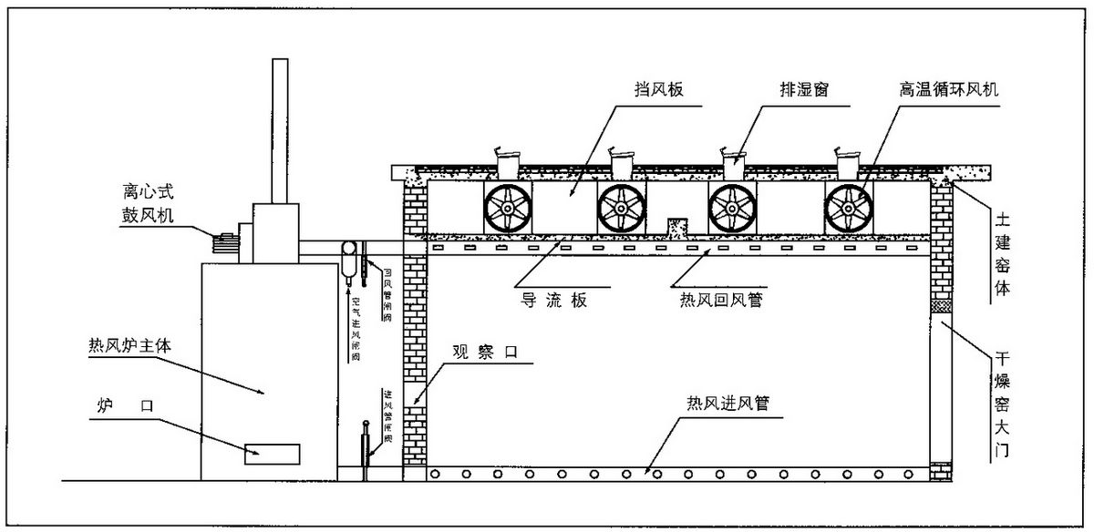 熱風式干燥設備工作原理是利用燃燒產(chǎn)生的熱能,加熱窯內(nèi)的空氣,由熱風爐頂部主風機將窯內(nèi)的空氣通過管道吸入爐體,將空氣加熱。再通過管道,送入窯內(nèi),由窯內(nèi)的循環(huán)風機不斷的循環(huán)對窯內(nèi)的木材均勻加熱。木材干燥過程中如需要蒸汽,可由熱風爐內(nèi)的蒸汽發(fā)生器提供,如果是一爐兩房或多房時,管道上裝有插閥,通過插閥的調節(jié)來控制窯內(nèi)的溫度。在干燥的過程中,由于木材要進行排濕,在窯頂上留有排濕孔(根據(jù)地區(qū)而定)和裝有抽濕機,用來調節(jié)排濕的快慢.